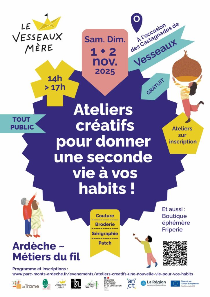 À l’occasion des Castagnades de Vesseaux, les artisanes et artistes textiles du projet Ardèche – Métiers du fil vous donnent rendez-vous au Vesseaux-Mère pour découvrir comment réparer et personnaliser vos vêtements avec créativité. Retrouvez également l’Armoire à puce, friperie, la Patchographie et une boutique éphémère pendant les deux jours de l’événement.